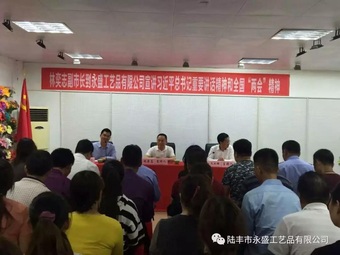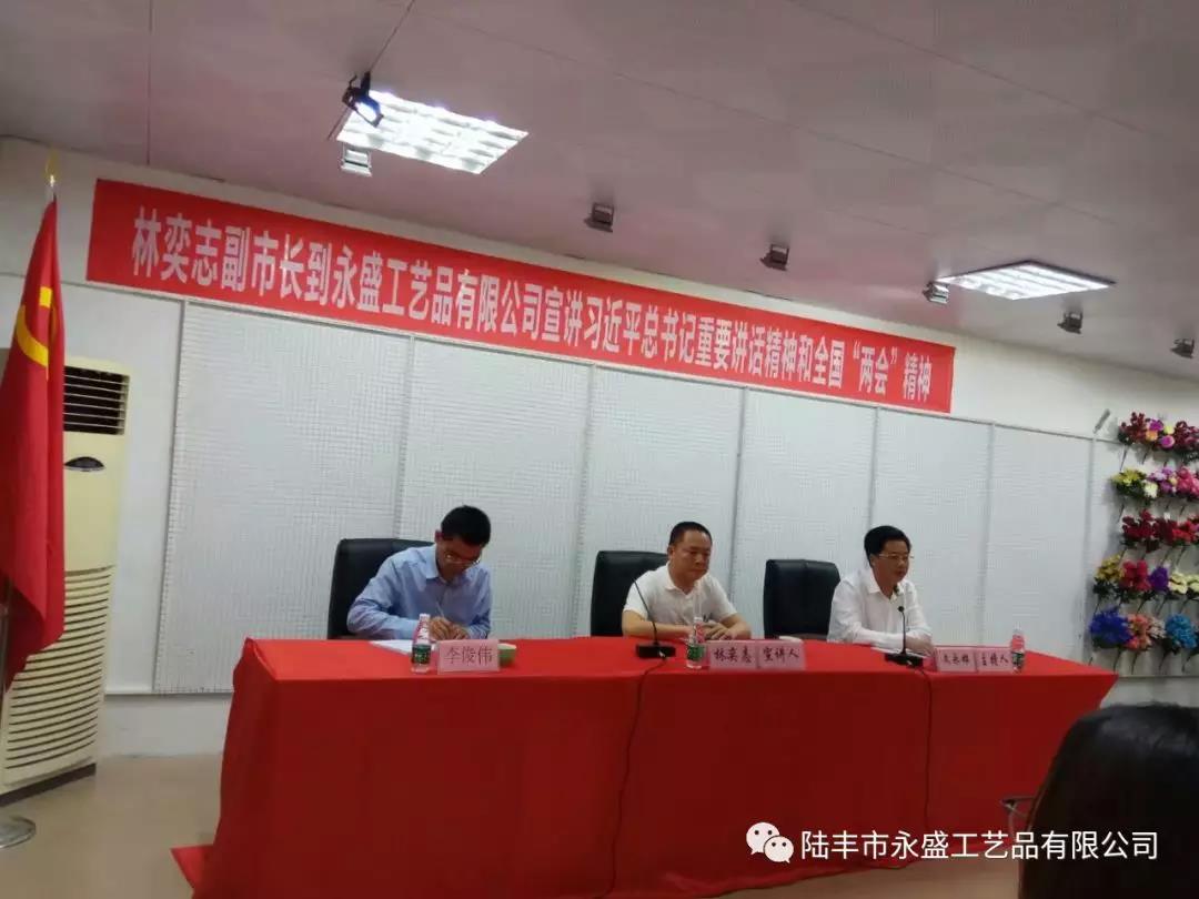 2018年4月12日下午,陸豐市政府副市長、公安局長林奕志到市永盛工藝品有限公司宣講習近平總書記重要講話精神和全國"兩會"精神,并作輔導報告。要求企業(yè)員工要切實把思想和行動統(tǒng)一到習總書記重要講話精神和全國"兩會"精神上來,學深悟透,做到真學、真懂、真信、真用,全面理解習近平總書記關(guān)于科技創(chuàng)新的指示和要求,用于指導企業(yè)發(fā)展,把創(chuàng)新思維作為企業(yè)發(fā)展的第一要務,把人才作為企業(yè)的第一資源,把創(chuàng)新作為企業(yè)發(fā)展的第一動力,推進企業(yè)做大做強。